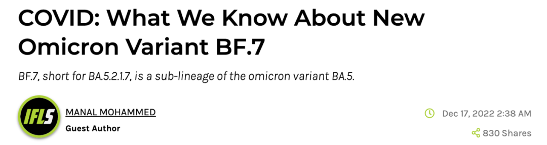 BF.7是 BA.5.2.1.7 的缩写,是 Omicron 变体 BA.5 的子谱系。