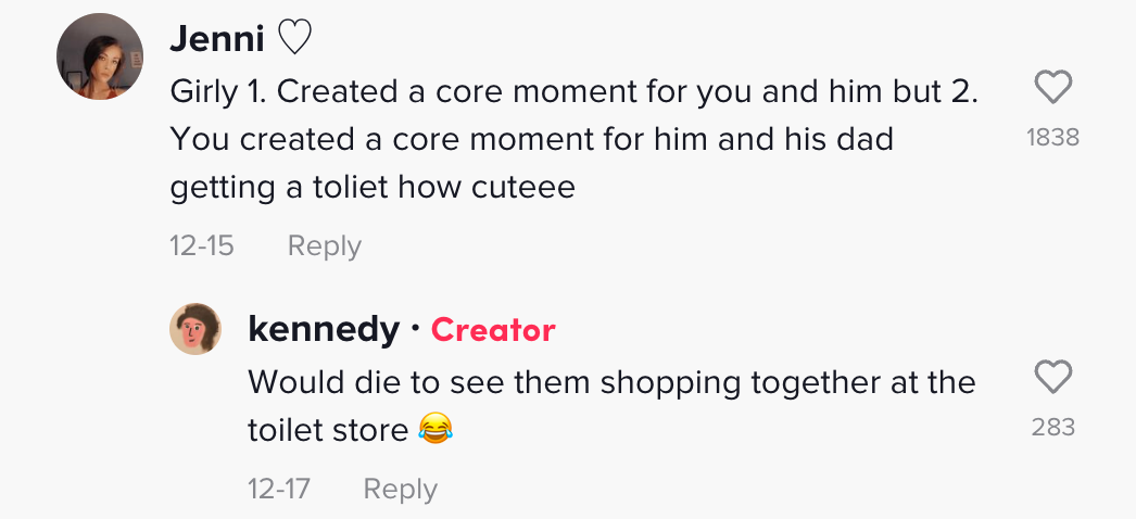 还有人说:女孩,1.你为自己和男友创造了一个重要的时刻,2.你为男友和他的爸爸创造了一起去卫生间用品商店共度时光的机会,好可爱。