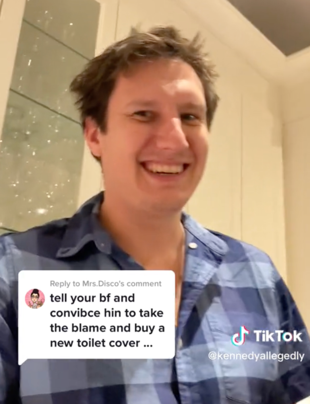 Kennedy于是和网友们讲述了这一“紧急情况”,她笑着说,现在不仅仅要告诉男友马桶堵了,还要告诉他自己把抽水箱的盖子也弄坏了。Kennedy还和网友们展示了破碎的盖子。真是想想就崩溃!
