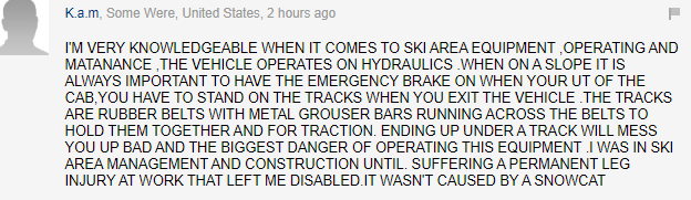 体娱媒体TMZ报道称,雷纳当时驾驶一辆PistenBully品牌的大型铲雪车,正在屋外小径上铲雪开道。不知道为什么,铲雪车突然卡住了。雷纳下车查看时,铲雪车的安全功能失灵,突然开动起来,雷纳的腿瞬间被卷入“车轮”——即铲雪车的滚动履带。