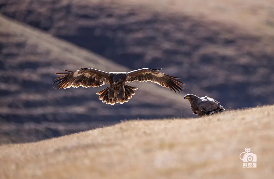秋季,草原雕完成繁殖后,在内蒙古克旗的大草原上开始聚群,补充体力后便会南下逾冬。为了赶上它们最后的“狂欢”,我在十一来到克旗,成鸟大都已经上路了,只见到当年的亚成鸟。太阳升起后,这些年轻的草原雕陆续来到食物丰富的草坡上,它们和成鸟的区别在于翼下覆羽颜色更浅,有白色条纹。只见一只草原雕迎面飞来,徐徐降落在草地上,两米的翼展很是威风,侧逆光下,散开的尾羽镶上漂亮的金边。能够展现草原环境的片子比蓝天版更加理想,因此机位很重要,不能太低,至少要平视,获得主体融入周围环境的效果。车拍的好处是可以随时调整角度,距离比较近,但此时太阳已经很高了,扰流严重,影响了画质。