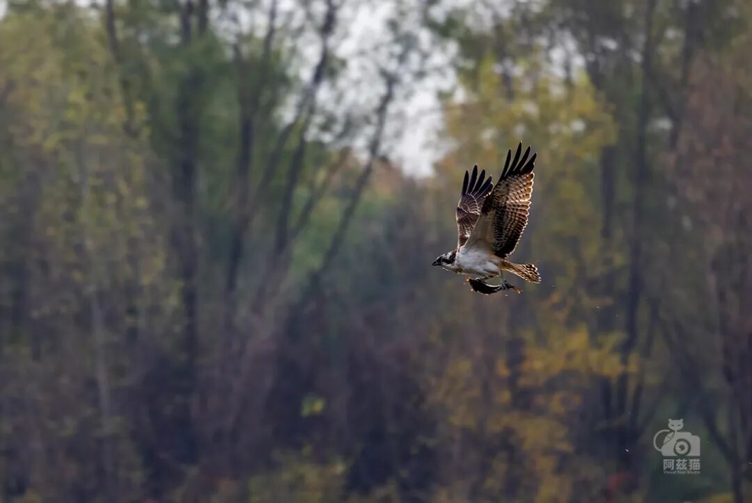 秋季迁徙途经京城的大鹗,停留一个月有余,每天频繁出没于郊区河流抓鱼,为鸟友们不断上演精彩演出,最多时密云河边有两百多门“大炮”对准天空。我没有选择顺光的机位,而是来到对岸。那天的天气有些阴,散射光很柔和,这只“带弹飞行”的大鹗在侧逆光下,鸟和鱼都镶上了“金边”,背景则是深秋时节的树林,相比大鹗冲入水中抓鱼的瞬间,我更青睐这种静谧优美的画面。