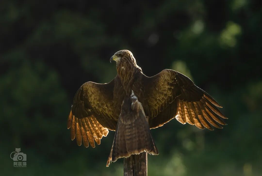 逆光下的鸟类有着明亮的轮廓光,但如果主体本身就是深色,很难拍出细节,黑鸢就属于这类。这是玉树常见的猛禽,数量多,不怕人,于是便给了摄影师更多的创作机会。夏季气温高,猛禽常会张开翅膀散热,看到这只正在树桩上休息的黑鸢,我选择了侧逆光的角度,这样光线可以穿过它较为厚重的棕褐色羽毛,半透明的羽毛更加富有质感,细节清晰,加上墨绿色的背景,黑鸢的霸气也一目了然。