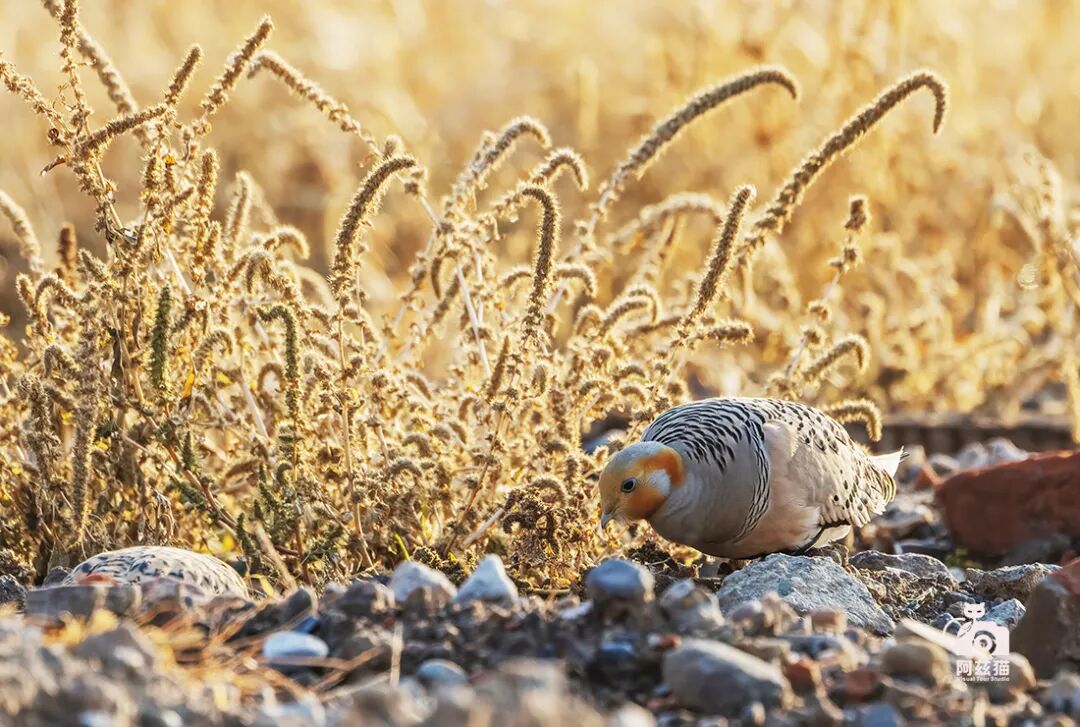 11月中的一次狂风,京城天气骤变,天空突降“毛腿沙鸡雨”,当天就有两百多起目击报告,来自城市的各个角落。大批处于迁徙途中的毛腿沙鸡不得不降低飞行高度,甚至迫降。之后的几天里,鸟人发现有两对毛腿沙鸡落到了房山大石河附近的农田中,它们没有急于离开,而是趁机休整补充下体力。一个晴朗的早晨,我终于见到了它们,这是今年继青海后第二次拍摄毛腿沙鸡。这几只胆儿还挺肥,那么多鸟友围观,依旧不慌不忙边走边觅食。它的双脚从脚爪到脚趾覆盖着浓密的羽毛,犹如穿着“毛靴”。侧逆光下,背景一片金黄,毛腿沙鸡雄鸟那沙黄色体羽与周围环境如此融洽,不得不感叹大自然的神奇创造力。
