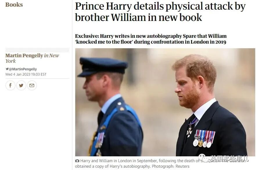 昨天,《卫报》曝光了书中的一段节选,写的是因为梅根的事,威廉对哈里大打出手,