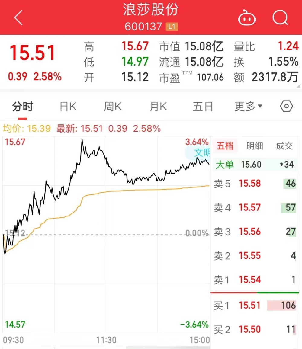 浪莎股份今日报收于15.51元,涨2.58%。