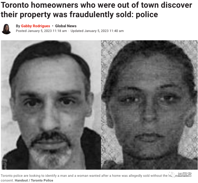 多伦多警方今天发出一份通告,通缉一对男女,称多伦多一所房屋的业主出差在外的时候,结果发现有人冒充他们并在未经他们同意的情况下出售了他们的房子。 多伦多警方告诉全球新闻(Global News)称,涉案物业位于怡陶碧谷。 警方调查人员称,2022 年 1 月,据称有两人自称是房主,并聘请了一名房地产经纪。 警方称,该房屋随后被挂牌出售,并卖给了新房主。 警方称,原来的房主当时出差,在国外做生意。而两名疑犯竟然能够成功出售房产,而新房主也已经交接并搬进该房子居住。 调查人员表示,在房子出售几个月后,原房主才发现自己的房子未经他们同意就被出售了。 几个月后,当房主回到多伦多后,发现自己家早已换了新主人,而自己而蒙在鼓中,于是报警。 多伦多警方公布了一男一女的照片,涉嫌使用假身份冒充真正的房主,因此受到欺诈指控。 任何知情者请致电 416-808-7310 ,或拨打 416-222-TIPS (8477) 匿名灭罪热线联系警方。 而根据早前的爆料,多伦多也有华人房主中招,回国后发现房子被卖掉了。 3年前,多伦多一名华人女房主在388 Yonge St买了一套公寓,买完房子后,房主于2019年中回国。 @煮碗芝麻汤圆提供照片 房子全款购买,没有申请银行按揭,也一直置闲没有出租。 2022年7月,人在国内的房主发现,本来每个月1日扣的Condo管理费没有扣,于是委托房产经纪去查下。 结果一查就吓人了,房子已经转手卖掉了。 2睡房的公寓以$97万低价卖掉,卖家是女房主的名字,但她却懵然不知。 据MSL上的信息显示,这套房子是5月20日挂牌,6月15日成交的。 当时她意识到自己身份信息可能被泄露了,于是打电话给银行,结果还是晚了一步,她账户里的$30万加币也被人转走了。 据女房主说,银行向她解释说,当时来了个中国女生,和她长得很像,拿着她的身份证件ID,仿冒签名把钱划走了。 在3年前回国的时候,并不知道自己会因为疫情回不来,所以只带了几套衣服,所以家里所有东西,包括电脑,名牌服饰鞋包全都没了。 她估算了一下损失:房子被以$97万成交,银行存款$30万,房子里各种物品财产加起来也至少有$15万,总共损失150万。 上述这类案件叫产权欺诈(title fraud),在大流行期间有飙升的迹象。 产权欺诈通常始于身份盗窃,如果有人窃取您的个人信息,就会发生这种情况。 下面根据加拿大政府官网的信息,讲述如何防范产权欺诈: 1、将您的抵押贷款信息保存在安全的地方,切碎旧文件而不是将它们随手扔进垃圾桶 2、如果您在支付抵押贷款时遇到困难,请先联系您的抵押贷款机构 3、在授予他人处理您的房屋或其他资产的权利之前咨询您的律师 4、研究向您提供贷款的任何公司或个人 5、在您所在的土地登记处进行土地所有权搜索,这将显示财产所有人的姓名以及在所有权上登记的任何抵押或留置权 6、考虑购买产权保险以防止产权欺诈,这将保护您免受与产权欺诈相关的损失 不过,如果房子有人住,或者房子有银行按揭,全款也申请个Line of Credit信贷额,房子想悄悄卖掉估计也不容易吧。