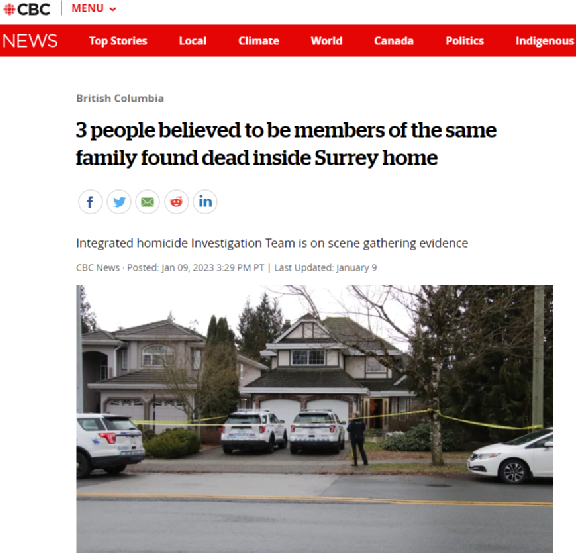 同天发生的另一起案件就惨烈得多。1月9日,素里警方消息称当天中午在156街夹112街附近的一间民居内发现了三具尸体,家中没有其他人存在。在新闻发布会上,素里警方表示已经确定三名死者来自同一家庭。