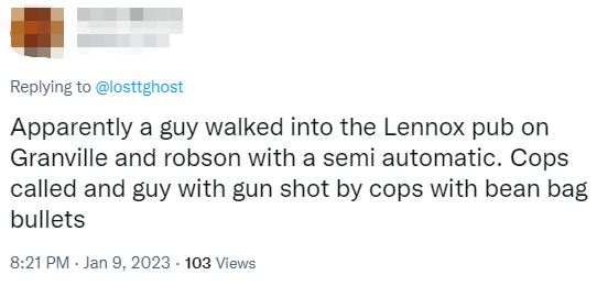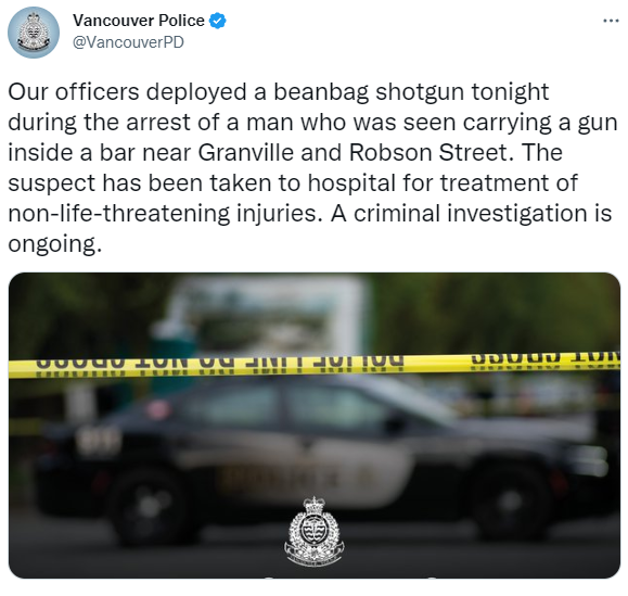 在Granville Street工作的目击者所言和警方描述相差无几,他补充说,男子手持的是一把半自动的手枪。在C-21法案通过后,加拿大全境禁手枪,该枪支已不可购买。