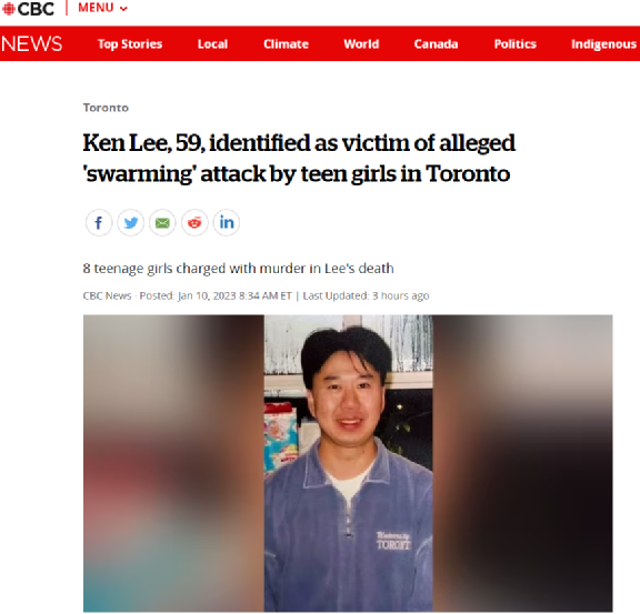 2022年12月18日,59岁的Lee先生在多伦多市中心收容所附近被一群女孩围殴刺伤,在送医后因伤势过重不治身亡。