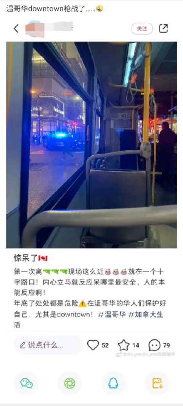 画面显示,该网友在温哥华市中心的公交车上。车辆行驶至太平洋中心(Pacific Centre)附近时,忽遇多辆警车封路。忽而,从街头传来一阵枪声,人群四散,场面一度十分惊险。