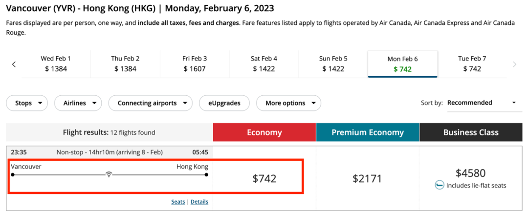 加拿大航空2月6日温哥华-香港的直飞航班,票价已经降至742加币,合3744人民币。