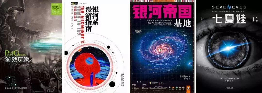 ▲《游戏玩家》、《银河系漫游指南》、《基地》、《Seveneves(七夏娃)》书籍封面