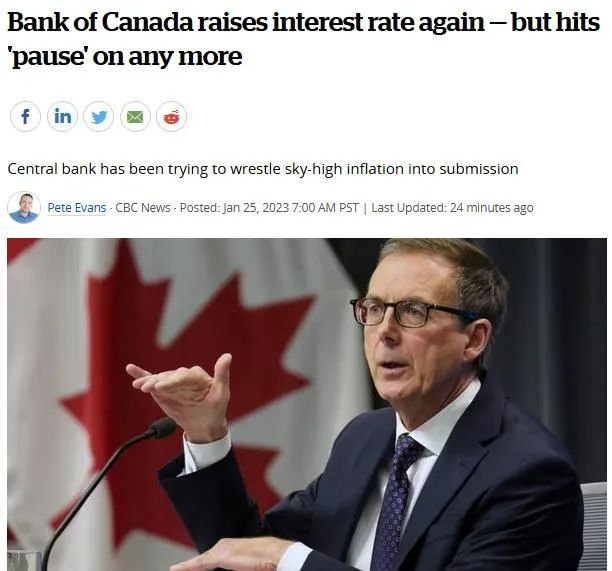 今天加拿大广播电视公司(CBC)报道了,加拿大央行央行行长Tiff Macklem宣布将隔夜利率上调 25 个基点,将政策利率从 4.25% 上调至 4.5%(这也是自去年 3 月以来的最小加息)。不过,央行说“暂时”(pause)不会再加了。