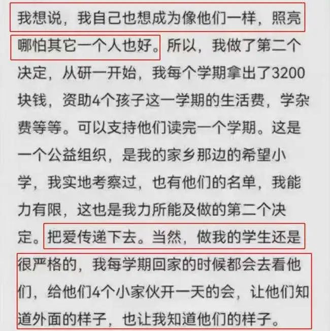 读研究生的第一年,凭借自己的努力,他稍有余力摆脱贫困后,第一件事便是将善意传递下去,每年都会拿出3200元资助其他贫困生。