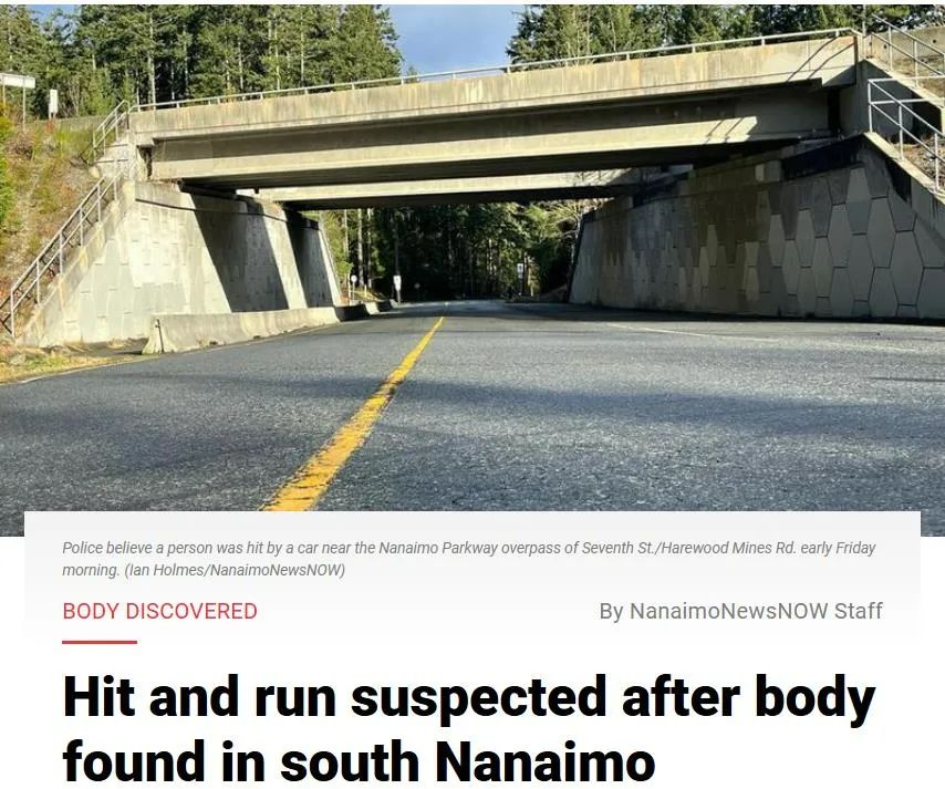 据Nanaimo News Now报道,事发在早上7:00左右,一个外出散步的人士,在在 Seventh St/Harewood Mines Rd. 的一侧、Nanaimo Parkway 立交桥附近和 Colliery Dam Park 南侧发现了一具尸体。