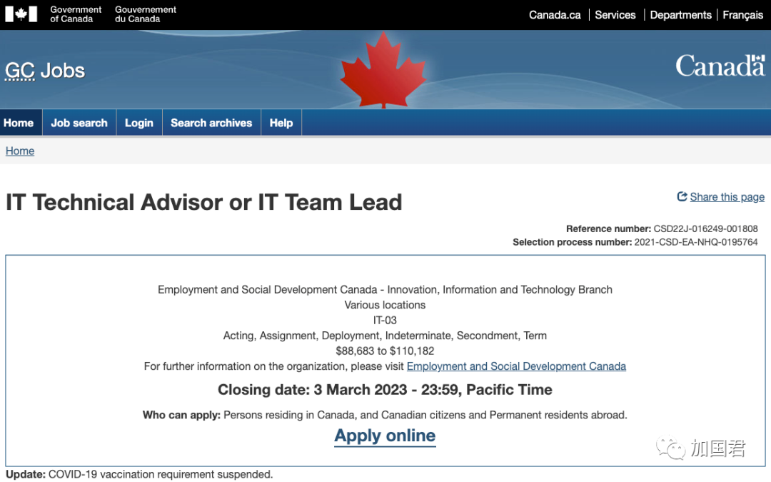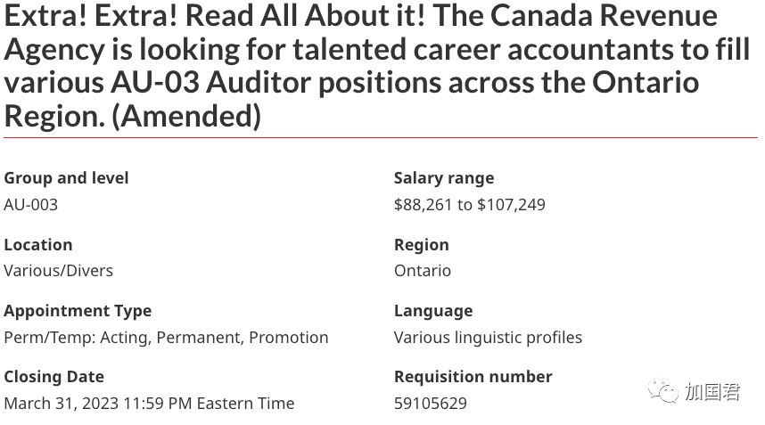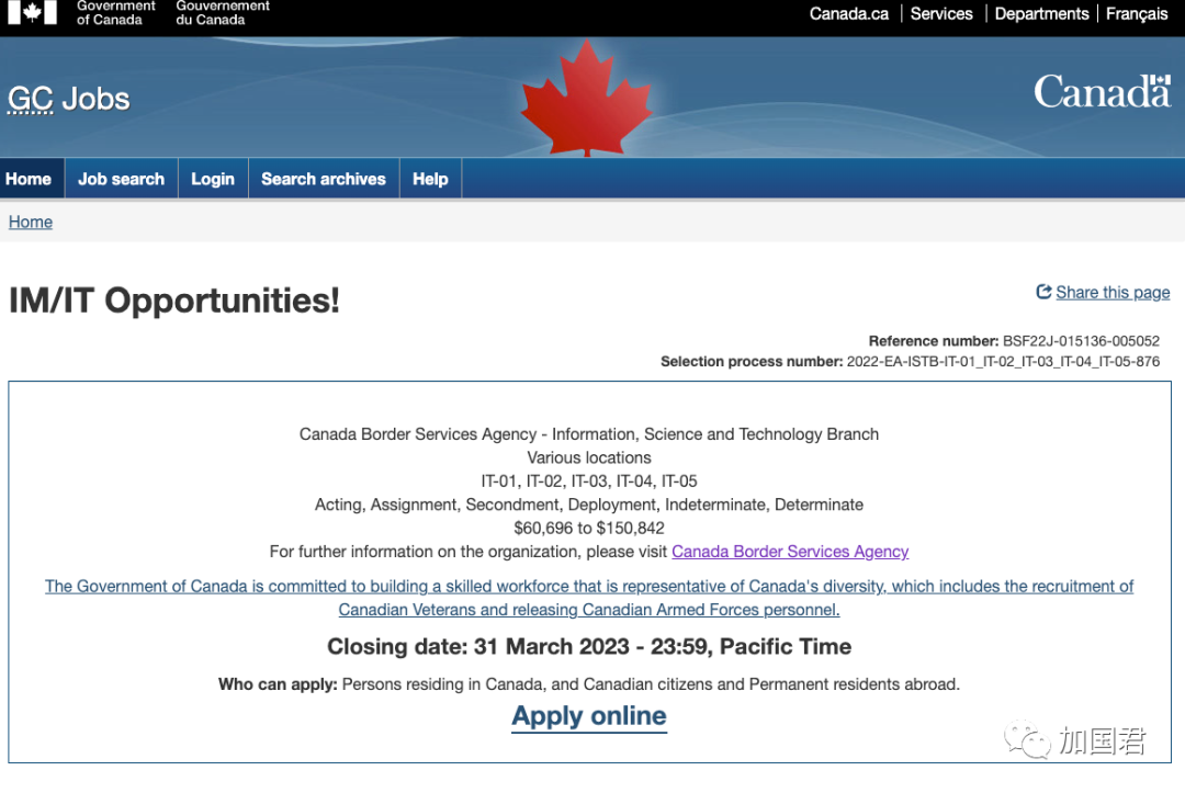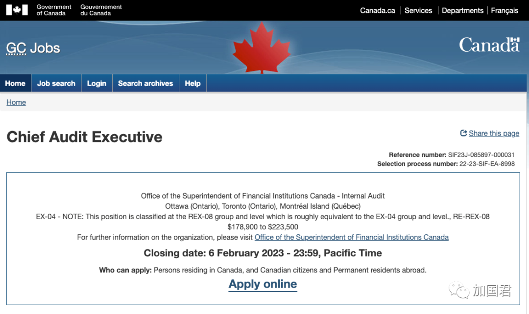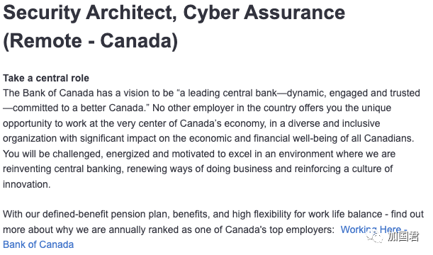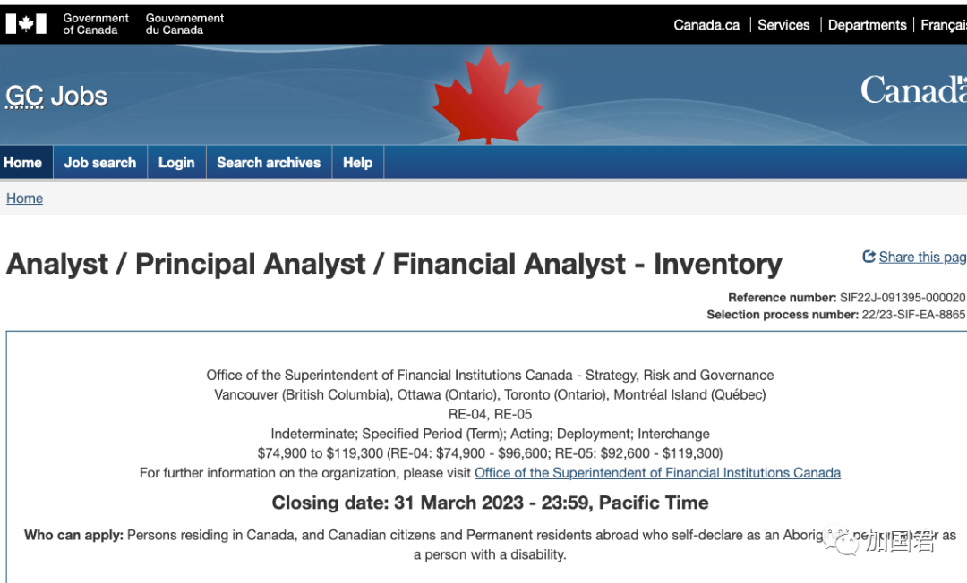 年薪最高$22万!加拿大央行、银监局等大量招聘!报名戳这里2023-01-30 |作者:佚名 | 来源:她乡HerlandLoading...分享: 现在加拿大政府有很多职位空缺,包括央行、银监局OSFI、边境局CBSA和税局CRA均有空缺,符合条件的可以在线申请,这些职位的年薪至少$100,000加元,最高223,500加元。 如果您正在找工作,可以考虑申请加拿大税务局 (CRA) 、加拿大边境服务局 (CBSA)等联邦政府部门职位。 一些职位包括护士、技术专业人员、审计员和 IT 技术顾问。 加拿大这些政府工不但人工高,福利好,对学历还要求不高,这些职位的教育要求从高中毕业到硕士学位不等。 下面逐个看看: 1、CBSA招聘IT职位,年薪最高:15万 加拿大边境局CBSA 正在招聘信息管理和信息技术职位,年薪:60,696 元至 150,842 元。 学历要求:在计算机科学CS、信息技术、信息管理或其他相关领域专业的2年课程毕业。 此外,还需要有在信息管理和信息技术环境中工作的经验。 详情: https://emploisfp-psjobs.cfp-psc.gc.ca/psrs-srfp/applicant/page1800?poster=1856224 2、护士:15万 加拿大原住民服务部招聘护士从业员,年薪:115,836 元至 148,590 元,包括适用津贴。 工作地点是安大略省、曼尼托巴省和阿尔伯塔省的偏远的原住民社区。 详情: https://sac-isc-gc2.hiringplatform.ca/processes/45425-nurse-practitioner?locale=en 3、外语交流分析师,包括普通话,年薪:10万 加拿大安全情报局 (CSIS)招聘多名外语交流分析师,正在寻找具有以下语言能力的个人,包括: 阿拉伯语 索马里语 波斯语 普通话 库尔德语 索拉尼语 俄语 旁遮普语 乌尔都语 印地语 孟加拉语 西班牙语 详情: https://www.canada.ca/en/security-intelligence-service/corporate/csis-jobs/available-jobs/foreign-language-communication-analyst.html 4、飞行技术团队负责人 加拿大运输部招聘飞行运营技术团队负责人,年薪120,741 元至 141,688 元。 申请者只要求高中学历,并拥有航空职业证书。 详情: https://emploisfp-psjobs.cfp-psc.gc.ca/psrs-srfp/applicant/page1800?poster=1890776 5、审计员:年薪10万 加拿大税务局 (CRA)招聘审计员,年薪:88,261 元至 107,249 元。 虽然只要求大专以上学历,但需要有专业会计师证书。 详情: https://careers-carrieres.cra-arc.gc.ca/gol-ged/wcis/pub/rtrvjbpst.action?pi=D06726B228B81EDDA6EA0A70D733E109 6、IT 技术顾问/IT负责人:年薪11万 加拿大就业和社会发展部招聘多名IT人才,年薪从88,683 元至 110,182 元 详情: https://emploisfp-psjobs.cfp-psc.gc.ca/psrs-srfp/applicant/page1800?poster=1728854 7、银监局招聘财务分析师:年薪12万 加拿大金融机构监管办公室OFSI招聘多名财务分析师,年薪:74,900 元至 119,300 元。 只需要大专以上学历,并有金融监管机构的经验。 详情: https://emploisfp-psjobs.cfp-psc.gc.ca/psrs-srfp/applicant/page1800?poster=1902023 8、央行招网络安全架构师:年薪12万 加拿大央行招聘网络安全架构师,远程工作,年薪99,340元至 124,175元。 详情: https://careers.bankofcanada.ca/job/Ottawa-%28Downtown%29-Security-Architect%2C-Cyber-Assurance-%28Remote-Canada%29-ON/566764117/ 9、食品检验局招实验室主管:年薪12万 加拿大食品检验局(CFIA)招聘科学实验室服务署主管,年薪98,216 元至 121,711 元。 详情: https://emploisfp-psjobs.cfp-psc.gc.ca/psrs-srfp/applicant/page1800?poster=1913004 10、首席审计执行官:年薪22万 加拿大金融机构监管办公室(OSFI)银监局招聘首席审计执行官,年薪:178,900 元至 223,500 元。 申请者除了要有本科学士学位和审计证书外,还需要领导团队、就复杂问题提供战略意见和建议。 详情: https://emploisfp-psjobs.cfp-psc.gc.ca/psrs-srfp/applicant/page1800?poster=1919186 阅读 未经允许不得转载:加拿大乐活网 »年薪最高$22万!加拿大央行、银监局等大量招聘!报名戳这里分享: