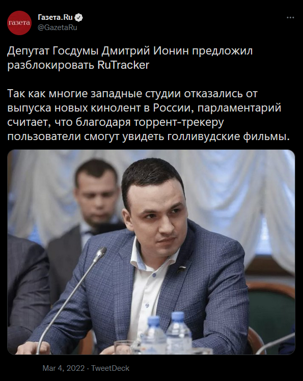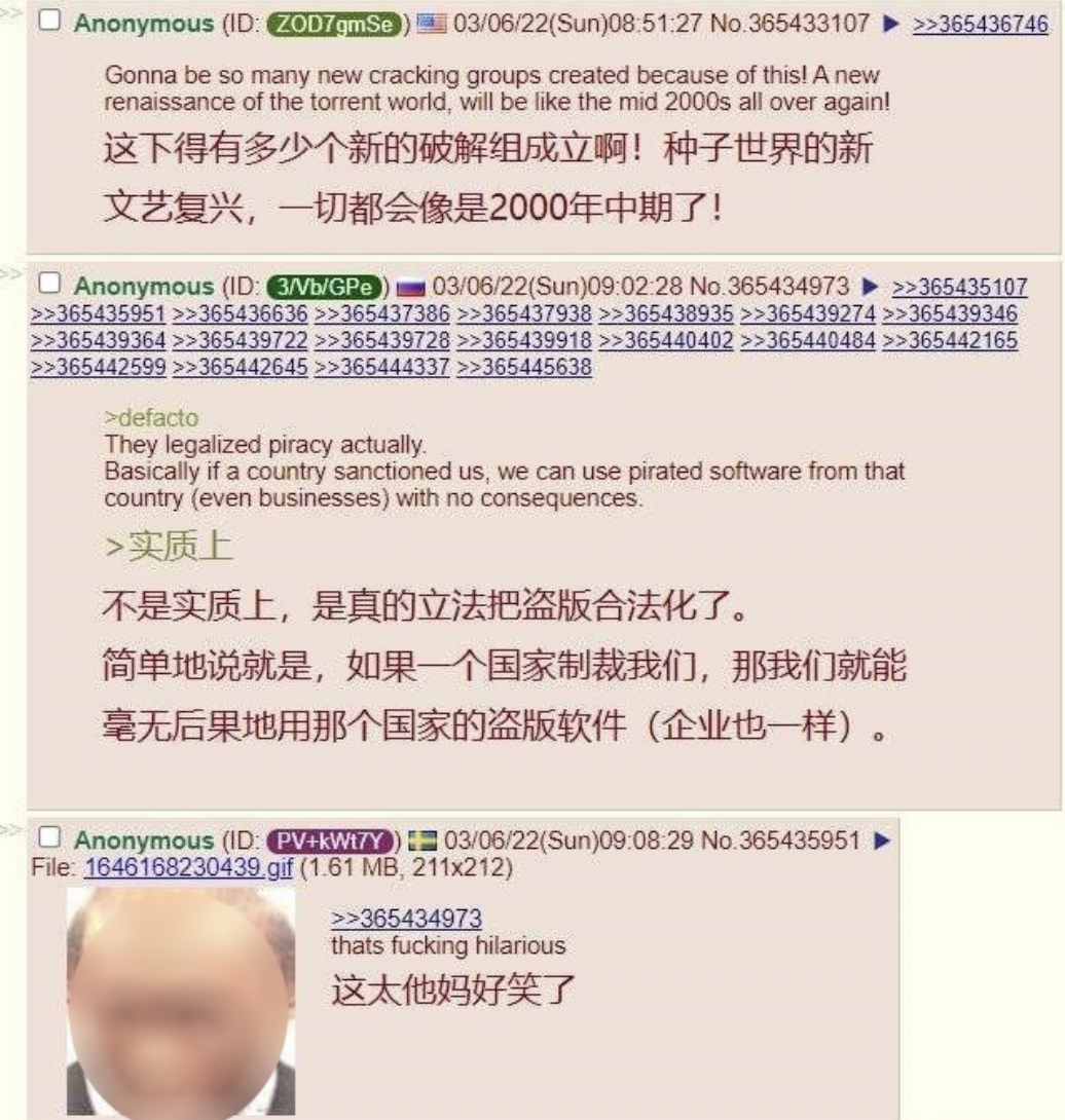 俄罗斯上映盗版阿凡达,同时呼吁人们不要在家中看盗版2023-02-02 |作者:小伟 | 来源:beebee公园亚洲俄罗斯Loading...分享:#俄罗斯#盗版因为明面上已与西方全面脱钩,最近俄罗斯院线不得已只有上映了盗版的阿凡达。 这些盗版资源来自哈萨克斯坦等友好国家,属于高质量的DCP拷贝,并配有精校俄语字母。 由于现行法律层面俄罗斯当局对盗版依然是禁止的,所以俄罗斯院线采用“买一赠一”方式。他们将一部长达17分钟的俄罗斯电影同阿凡达捆绑放映。观众在购买正票观看完这部17分钟的电影后,便能免费观看一部190分钟的附赠片。 让人哭笑不得的是,由于阿凡达在俄罗斯网络上也有大量高清资源,俄罗斯一些电影院通过媒体呼吁人们请来电影院观看盗版影片。 目前包括网飞、迪斯尼、华纳兄弟、索尼、派拉蒙和环球影业等均对俄罗斯实行了断供。而这些公司制作的电影约占俄罗斯电影市场70%。 在俄罗斯,院线播放盗版欧美电影的另一种方式是,由一家与院线无关的皮包公司去影院租一个场子,然后在通过非正常渠道的方式在网络售票。这样观众去电影院看盗版的行为就被解释成了一次公司团建。 与此同时乌克兰人则在防空洞里观看影片。 毫无疑问,西方对俄罗斯在各领域的切割已经到了令人发指的地步。 丹麦是俄罗斯最大的皮毛供应国,主要向俄罗斯出口水貂皮。据俄罗斯媒体RBC报道,断供后俄罗斯的毛皮大衣制造商和销售商面临严重进口皮毛短缺问题。俄罗斯最大的皮草零售商之一Snezhnaya Koroleva的门店关停了三分之一。 他们连貂皮大衣都不想让俄罗斯人穿。 美国数字货币交易平台Coinbase宣布冻结俄罗斯相关的25000个交易地址,并把信息分享给了美国政府。 Xbox、EA、CD Projekt、暴雪、Epic等知名游戏公司的正版游戏现在你在俄罗斯都玩不到。 甲骨文、英特尔、思科、微软、英伟达、苹果、索尼、等科技公司也终止了在俄罗斯的所有业务。 而俄罗斯经济发展部从去年起就开始考虑反制。 侵权是俄罗斯刑法的一部分,最高可判处六年监禁和最高50万卢布或相当于违法者三年工资的罚款。 因此俄内部起草了一套针对“不友好国家及地区”的措施。具体来说就是如果版权所有方来自“不友好国家及地区”,并且在本国没有可替代的产品,那么就可以不经版权方允许使用或续签。如果行为对版权所有方造成经济损失,理论上只需赔付受损额度的0%。 当然从本质上讲,该提案只是解除了在俄罗斯使用盗版软件的法律后果,具体尺度拿捏在官方手中。俄罗斯盗版行为在其他方面的执行依旧非常严格,甚至被滥用为屏蔽网站的借口。 为突破封锁,俄罗斯“人大代表”国家杜马副主席德米特里·约宁去年提议解锁俄罗斯最大盗版网站RuTracker。 RuTracker是说俄语的海盗湾,里面有任何你想找的资源,包括周杰伦。RuTracker2004年建立,拥有1300万会员。 国内资源网不少货就是搬运自RuTracker,拿过来后简单打个汉化就发布。 2016年由于当时俄罗斯为满足网飞准入需求,封闭了俄罗斯国内访问RuTracker的途径。并抓捕了与网站有关的一批黑客,给俄罗斯破解圈带来极大地震。 虽然俄国以外地区一直能够访问RuTracker,加上擅长上网的俄罗斯人也一直能够找到办法登录。 但来自官方的声音,依旧给信仰00年代中期互联网世界法则的人,带去不少精神上的振奋。4chan网友起哄说这是种子世界的文艺复兴。 但是RuTracker及网络盗版团体复兴的最大收益人可能是美国人。全球最大分布式计算平台之一阿卡迈科技2021年调查发现,全球盗版资源网络访问量最大源头来自美国,为135亿。相比之下榜眼俄罗斯才72亿,探花印度65亿。 事实上俄罗斯人的突围不局限于文化产品。 去年在俄罗斯经营了30年的麦当劳于5月宣布关闭在俄全部800多家门店,并永久退出俄罗斯市场。 而在夏季结束之前这些门店就被俄版麦当劳Vkusno & tochka全部接盘重整开业,品牌主色调变为了绿色。 新公司的质量经理亚历山大·梅尔库洛夫对媒体表示,汉堡的成分没有改变,先前麦当劳用的设备也完全保留。 公司CEO帕罗耶夫提到新公司的目标是让客人们注意不到质量和氛围与从前的差异。 Vkusno & tochka开业第一天曾有一名男子举着一个牌子,上面写着“还我巨无霸”。然而他很快就被餐厅工作人员护送出去了。 另外俄版麦当劳的儿童套餐不附赠玩具而是书籍。 盗版在俄罗斯其实有很大群众基础。 据《俄罗斯报》报道,全俄仅有15%的电子书使用者付费购买电子书,大部分人仍选择下载免费和盗版书籍。 2017反盗版公司Irdeto一项调查显示,超过85%参与调查的俄罗斯人称他们并不认为盗版是一种违法行为, 66%的人称制作或观看盗版内容不存在任何问题。这与美洲和亚太地区形成鲜明对比,其中52%的受访者表示他们在发现是盗版内容后会停止观看。 2018年美国联邦贸易委员会发现俄罗斯所有安装软件有62%是未经许可的,高于全球水平37%。尽管这个数字很严峻,但它实际上仍体现了一些重大进展。根据莫斯科时报 1996 年的一篇文章,这一数据当时为91%。 俄罗斯黑客在世界上与伏特加和棕熊齐名。 网络安全组织Crowdstrike调查发现,俄罗斯黑客攻破系统平均时间世界第一,并且一骑绝尘,完全和其他选手不在一个量级。 俄罗斯黑客的凶猛源于他们都是前苏联发展军工复合体培养的国家队人才,解体后丢了工作,干起了宋江的生意。 