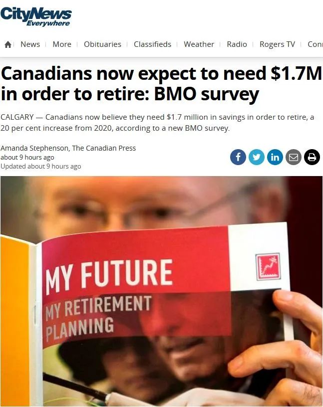 加拿大人认为,要退休得攒足170万元(加币,下同),与2020年时人们对退休积蓄的期望值相比,又攀升了20%。BMO金融集团财富分配和咨询服务主管Caroline Dabu表示,调查结果反映了加拿大人对当前经济的情况很是忧心。