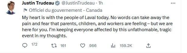 魁省省长 Francois Legault 也在社交媒体上写道:“今天早上在 Laval 市发生了超级可怕的悲剧,没有什么比为你的孩子感到害怕更糟糕的了。我想到的是孩子、父母和日托中心员工。”