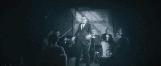 1950年代,男主角坐在电影院里,镜头中忽然闪现出一整个电影史发展脉络:从默片,到有声片,从黑白片,到彩色片,以至于到了后来,还出现了像《终结者》《黑客帝国》《阿凡达》此类的技术大片。