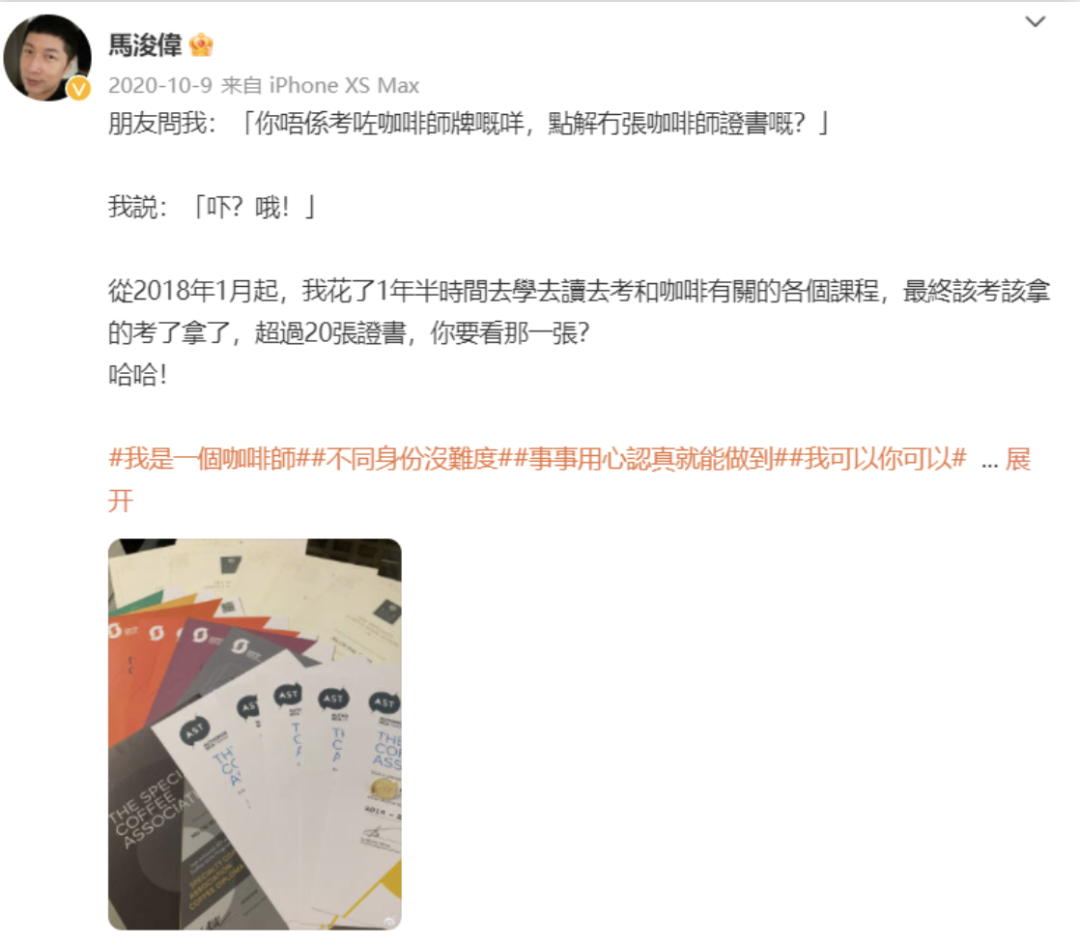 从2018年到2020年,他利用空闲时间学习咖啡知识,用一年半时间考了20多张证。