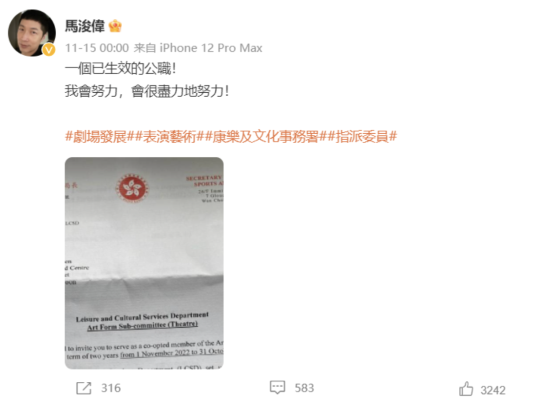 前段时间,他发了条微博,宣布正式成为演艺专责员会辖下戏剧类的委员。