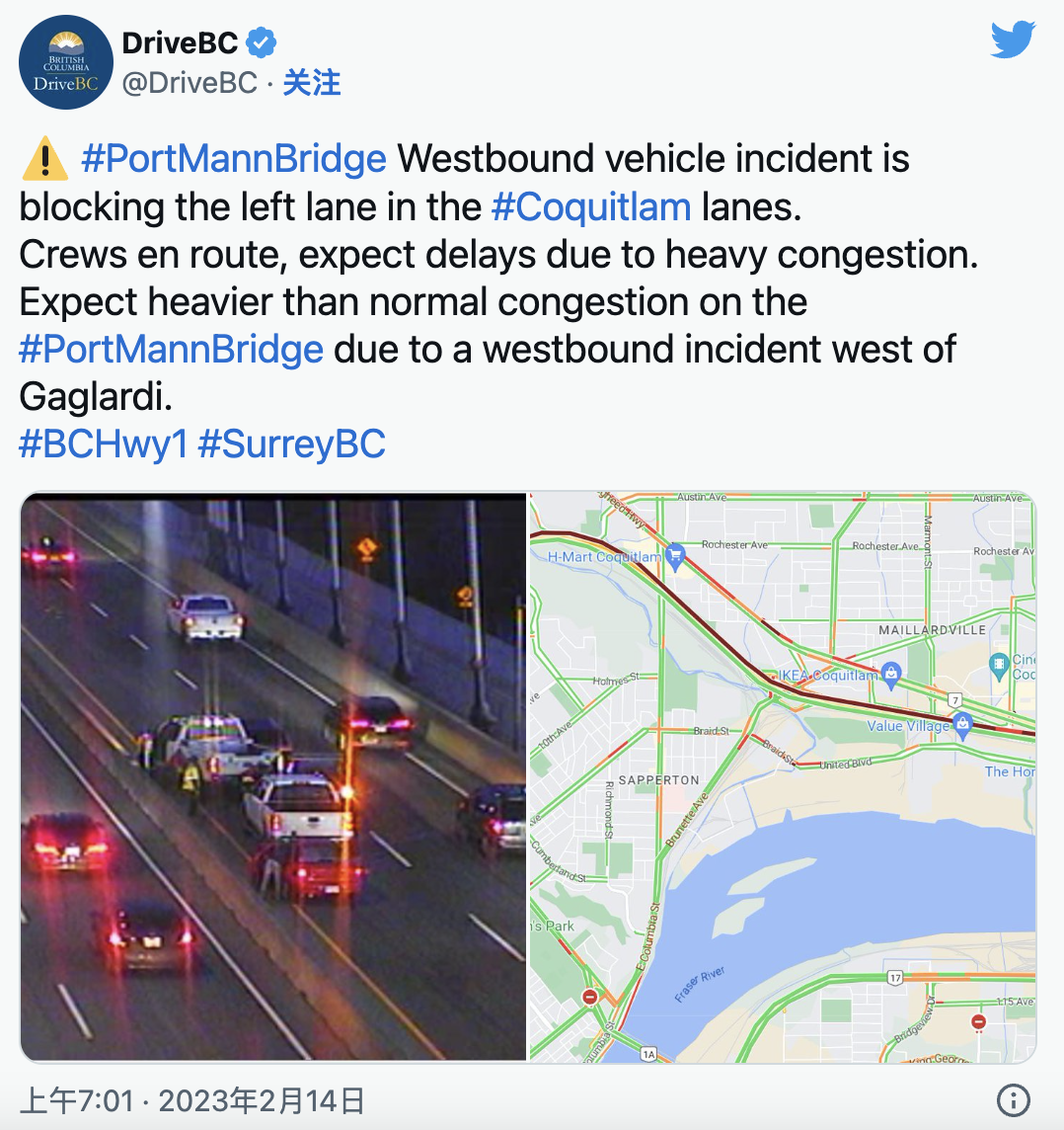 DriveBC表示,车祸导致Port Mann大桥Coquitlam一侧车道彻底被堵。