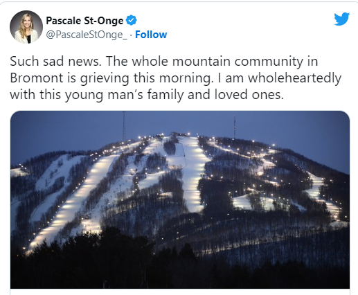 “这是个悲伤的消息,” 当地Brome-Missisquoi选区国会议员Pascale St-Onge在Twitter上表示。“整个在Bromont的当地社区在今天早上都处于哀悼之中。我的心真挚地与这名男子的家人及至亲同在。”