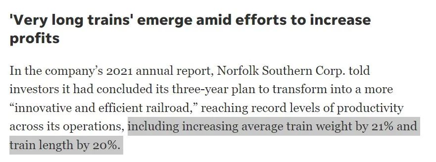 而诺福克南方公司也并不是唯一一家这样做的公司。根据两家主要铁路公司向美国政府问责署提供的数据,2017年列车的平均长度在1.2至1.4英里之间(1.9千米-2.6千米),比2008年增加了25%。行业贸易组织美国铁路协会发现,在过去10年里,火车增加了大约2700英尺(约0.8千米),也就是说每辆火车增加了26节车厢。
