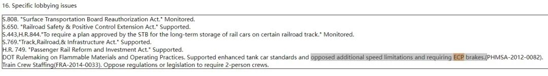 观察者网查询诺福克南方公司2015年的游说文件发现,该公司指出,它曾游说国会和负责制定交通部规则的行政机构,“反对额外的限速和要求ECP制动系统”。(注:ECP制动系统即电控空气制动系统,相比传统自动式空气制动系统容易造成断钩、脱轨等安全事故,ECP可进一步实现全列车同步制动、缓解,减小制动距离及列车纵向冲动。)