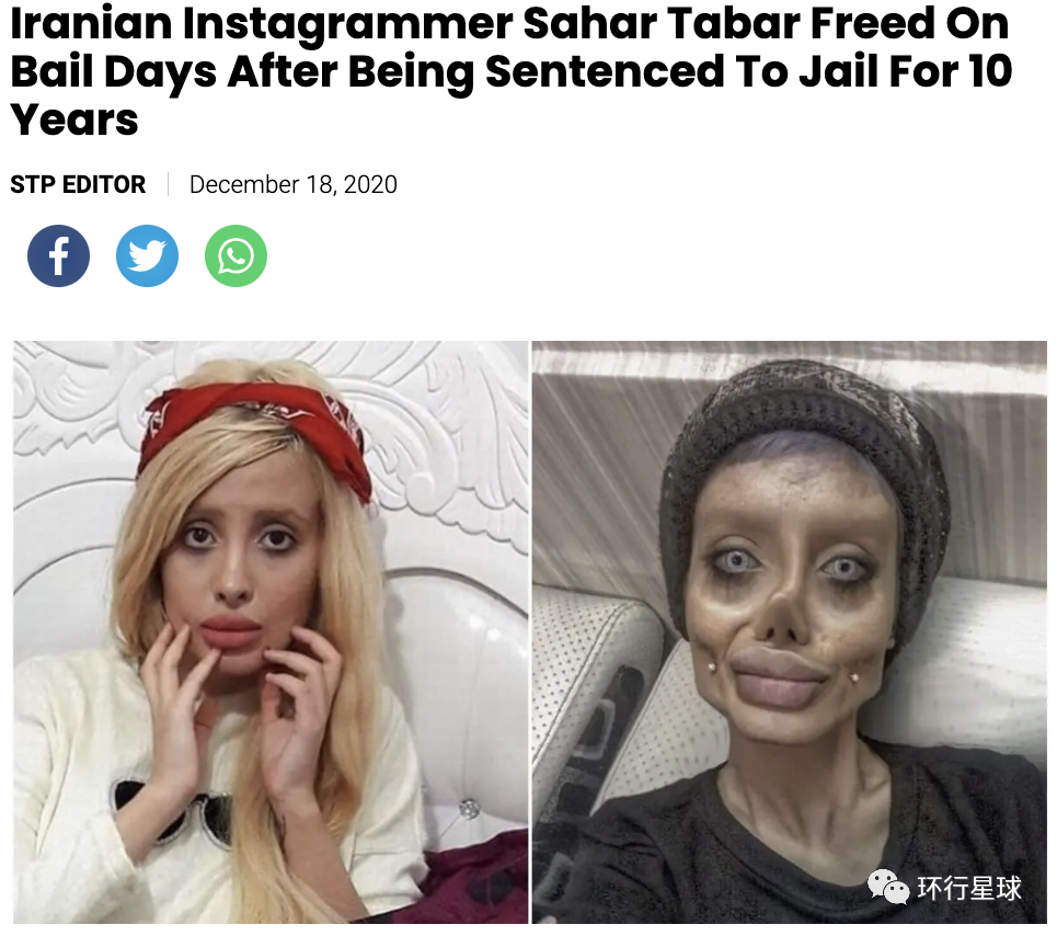 伊朗一位网红女孩萨哈尔(网名Sahar Tabar),不仅沉迷整容,还通过化妆P图成僵尸版安吉丽娜·朱莉来博眼球。2019年她遭到当局逮捕并判处十年监禁,罪名是亵渎神灵、言论不当、通过欺诈非法获利、违反国家着装规定及腐化年轻人等。虽然最终她被保释出狱,但造成的影响十分恶劣。