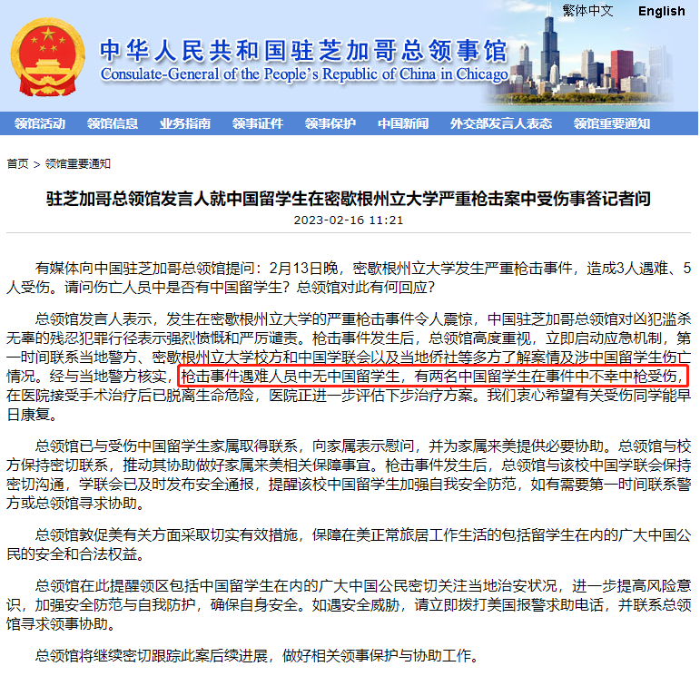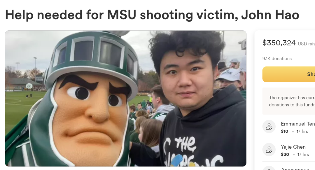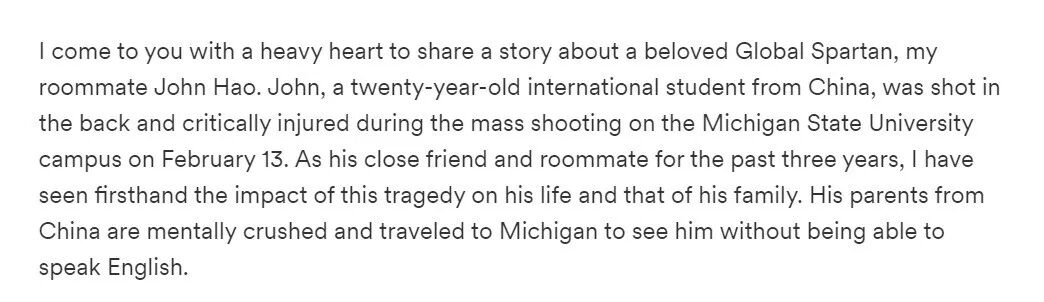 据报道,John Hao是一个来自中国的20岁的留学生,在2月13日密歇根州立大学校园的大规模枪击事件中,他背部中弹,伤势严重。