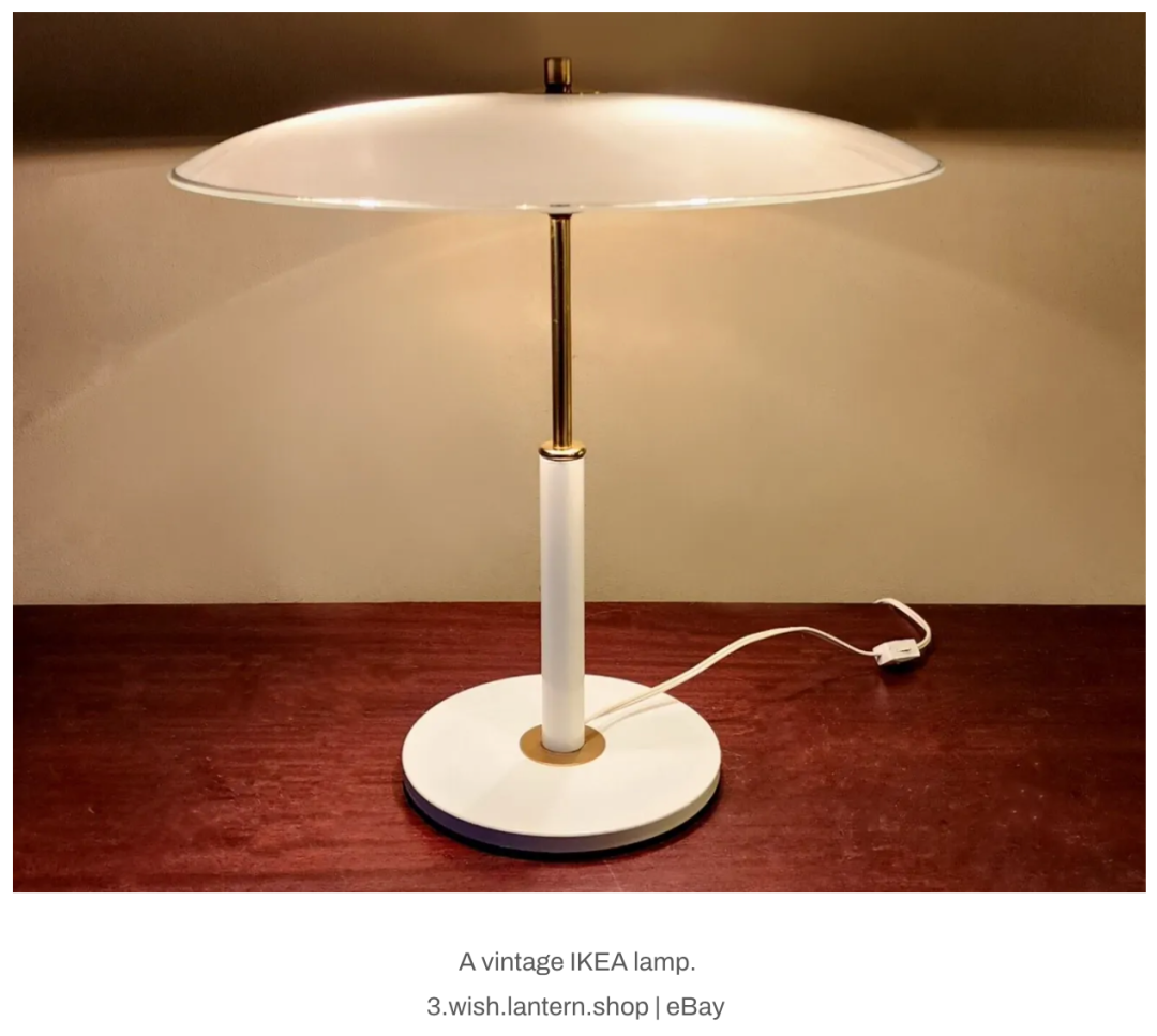 这款复古台灯看起来就是爷爷奶奶们的最爱。这款形似蘑菇的蛋白石玻璃黄铜台灯也是宜家收藏家的热款,在网上被拍卖至500-900加元不等。卖家也不确定它的具体日期,不过却可以保证,它并不是那么的老旧。