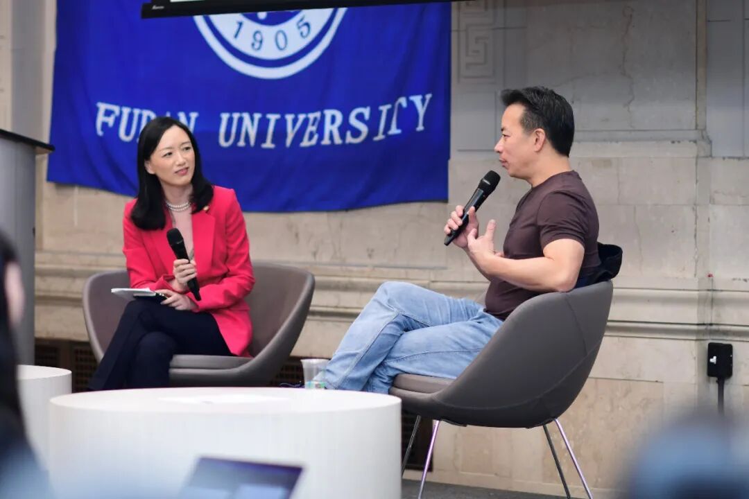 沈市长开题演讲结束后,接受了复旦校友会副会长、安众资本创始人及CEO赵群女士的专访。他们的问题和回答都非常精彩和真诚,他们把参会者当作自己的朋友,真心分享自己的成长经历和对职场以及社会、科技的看法,受到一致的好评。