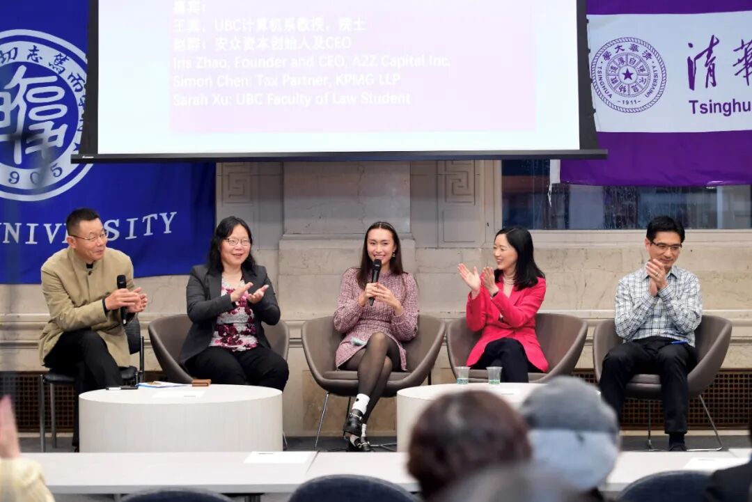 圆桌讨论由清华校友会前会长、教育和投资专家曹永刚先生主持,嘉宾为UBC电机与计算机工程系教授王真教授、院士(清华校友)、安众资本创始人兼首席执行官赵群女士(复旦校友)、KPMG会计师事务所合伙人Simon Chen以及父母均为清华校友的UBC法学院学生Sarah Xu。嘉宾们首先各自进行了简短的开题陈述,然后在曹永刚先生的组织下开展的热烈的讨论,并且和嘉宾进行了互动。