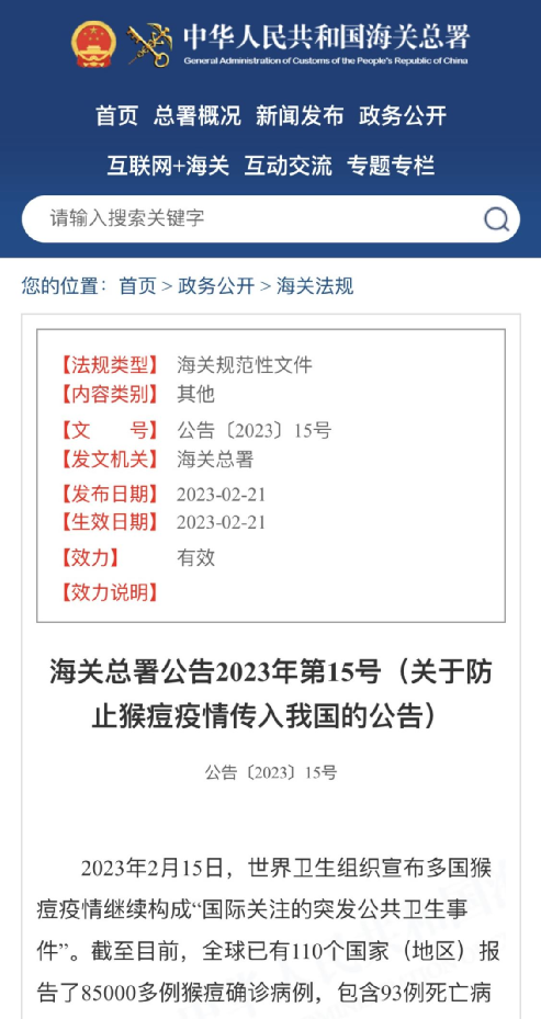 2月21日,中国海关总署发布《关于防止猴痘疫情传入我国的公告》,赴华有一种情况要主动申报。