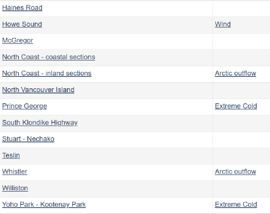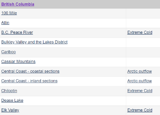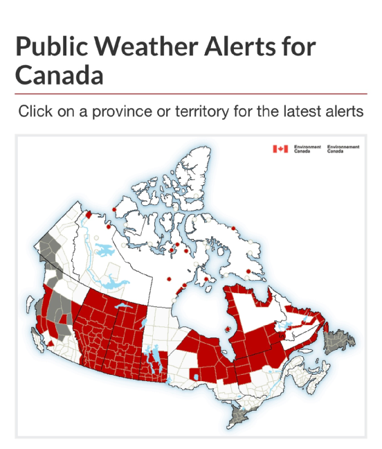 目前,加拿大环境部已经向阿尔伯塔省全部、萨省、BC省、安省北部、魁北克省、纽芬兰和拉布拉多省、努纳武特地区以及曼尼托巴省南部地区发布了多达153条极寒警告。
