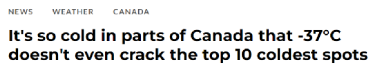 追踪世界上最极端天气的WX-Now发布最新天气报告称,2023 年 2 月 23 日,也就是今天,加拿大前 10 个最冷的地方温度都低于 -37°C。