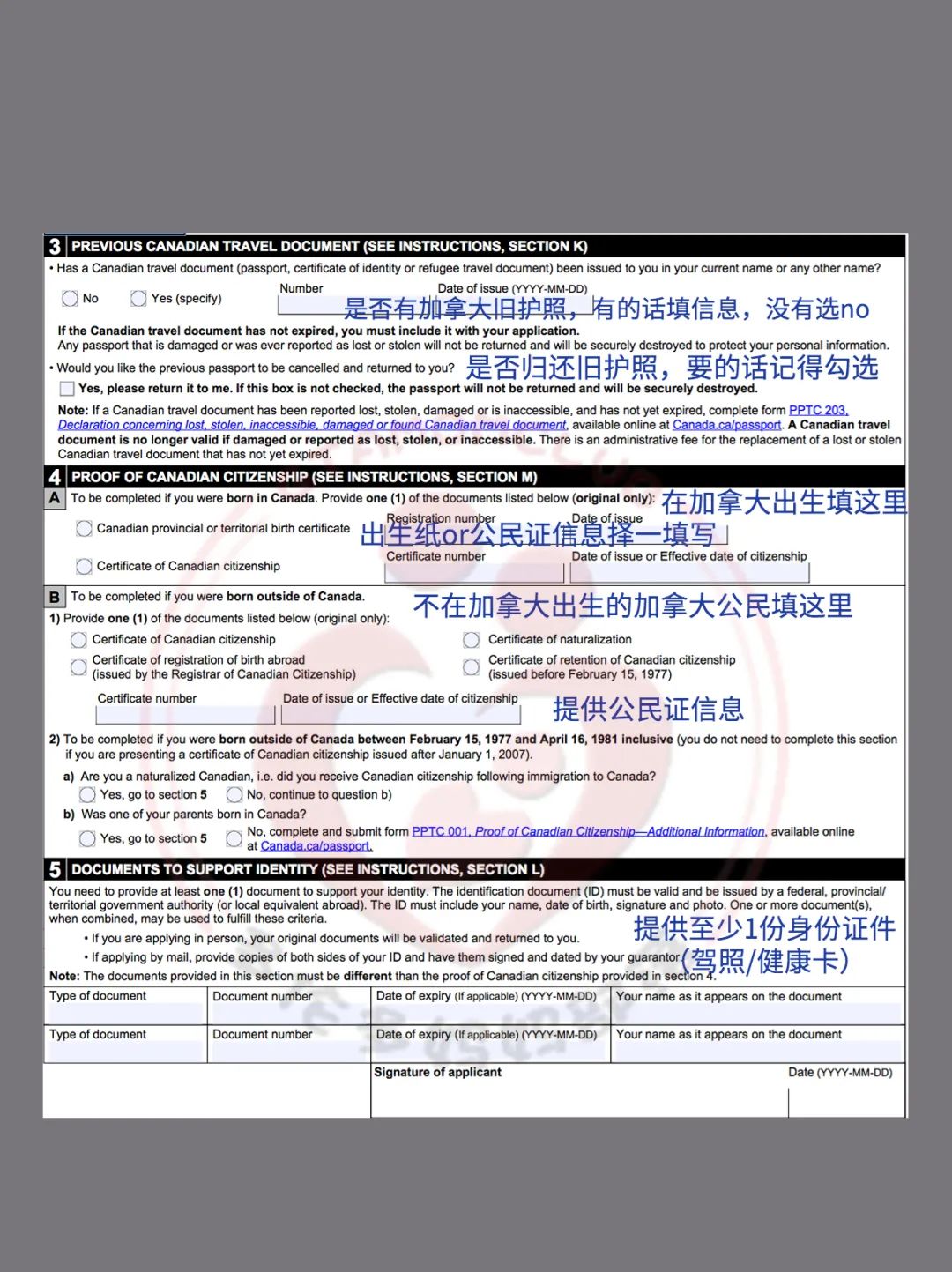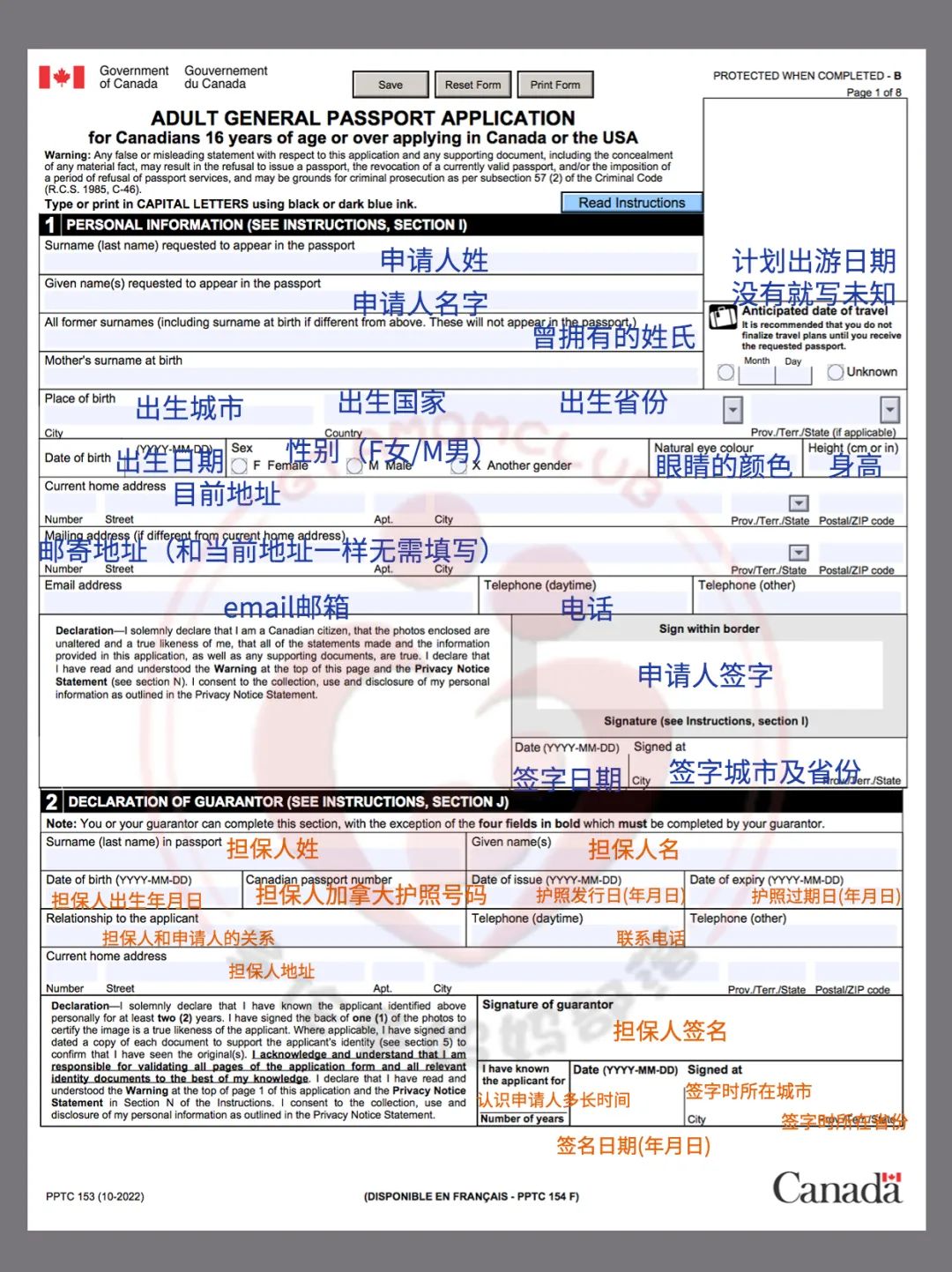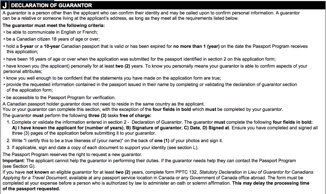 Guarantor担保人:持有有效期1年以上加拿大护照,认识你2年以上的非家庭成员。(护照中心会随机打电话去确认,建议找一个可以说英语的并且事先把你自己的资料给担保人)需在表格以及照片上签字。