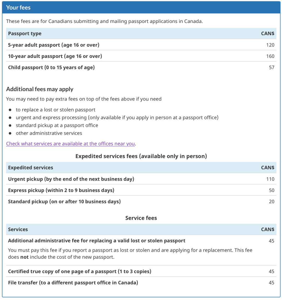 儿童护照申请费用:$57,加急等额外服务需另外付费。邮寄申请可直接在表格上填写信用卡号码,也可以附上申请金额的Certified Cheque/Money Order。现场申请可接受信用卡、debit卡付费。