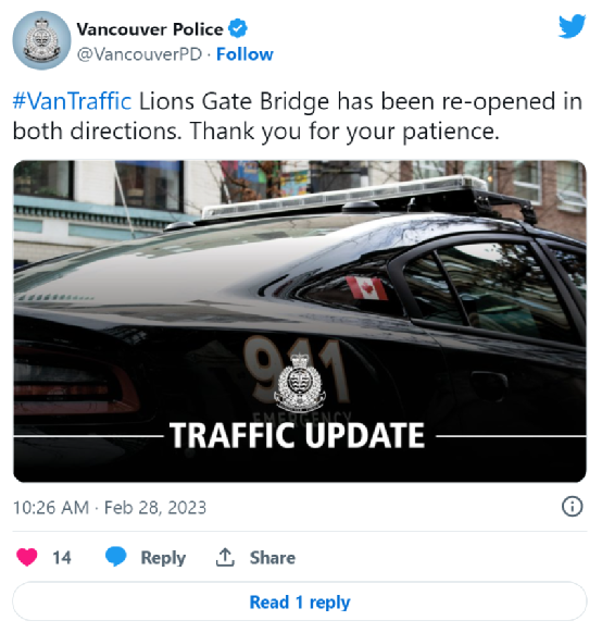 这段封锁了持续了2小时左右,最终在早上10时26分,路面状况稍稍恢复,封锁才被解除。
