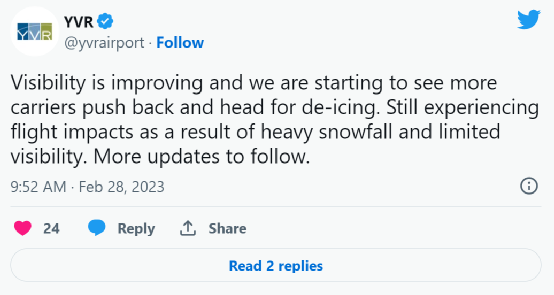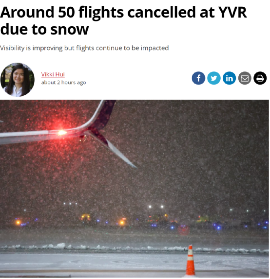 温哥华机场友情提示:尽管目前工作人员正在努力除冰铲雪,能见度也在逐渐改善,但由于条件仍不理想,YVR 的航班时刻表仍在进行调整。