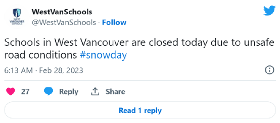 大规模停电的西温哥华表示:西温的学校今天关啦,因为道路状况实在不安全。