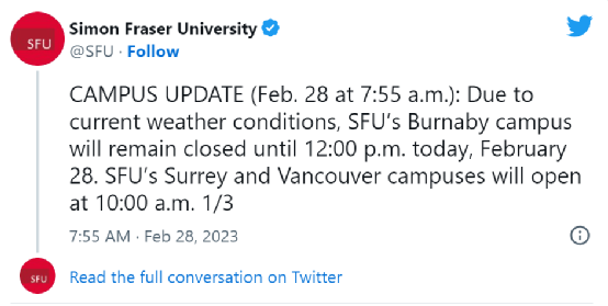 不同大学也做出了一些调整:西蒙菲沙等大学给早八人放了个假,表示学校将在10点后再重启校园。