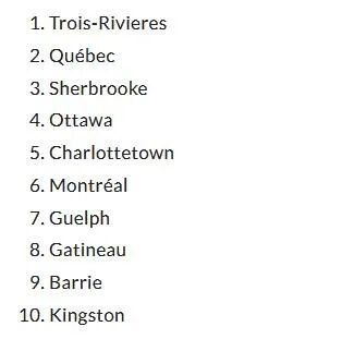 最适合养家的前十名城市中,在魁省的有5个,除了Trois-Rivieres,还有Quebec(2)、Sherbrook(3)、蒙特利尔(6)、Gatineau(8),安省有4个,分别是渥太华(4)、Guelph(7)、Barrie(9)、Kingston(10),另有一个是爱德华王子岛的 Charlottetown(5)。
