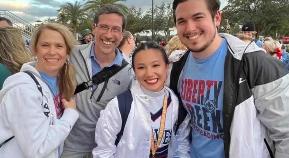 由中国领养来的田纳西州15岁高中生艾利亚‧布鲁克斯(右二),遭倒塌的树木砸中丧生。图她为生前与家人合影。(图源:GoFundMe网站)
