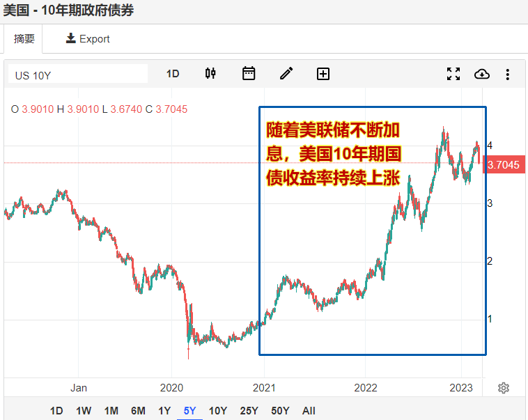 我们以10年期美国国债为例:随着美联储不断加息,债券收益率不断上升,目前已经达到了3.7%。