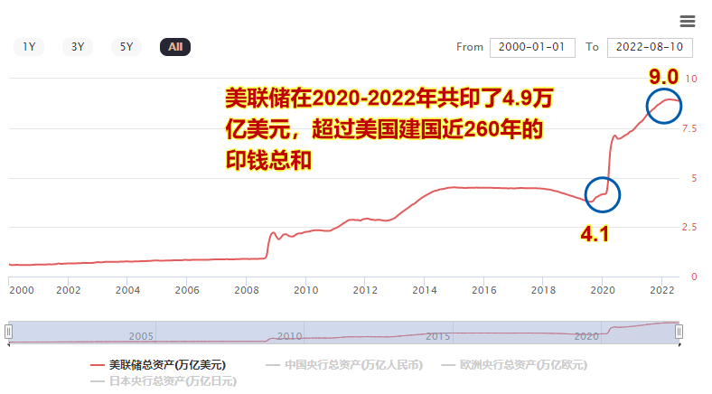 大家看下面这个图:疫情发生以后,大量企业倒闭,大量老百姓失去工作,于是美国就开动印钞机救助企业,同时为了不让老百姓造反,不得不给老百姓免费发钱……仅仅在两年时间内,美联储就印了4.9万亿美元,超过美国建国以后的总和。