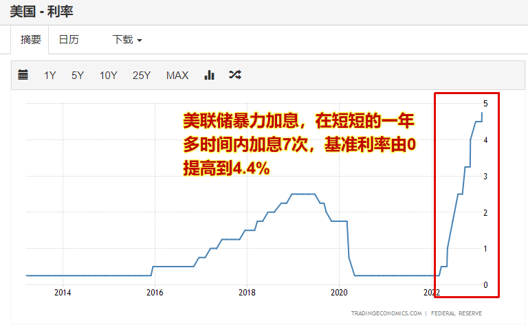 由于美国的物价指数实在是太高了,“温和”加息根本没有啥用,于是美联储开启了“暴力”加息模式——美联储在短短的一年多时间内加息7次,基准利率由0提高至4.4%。